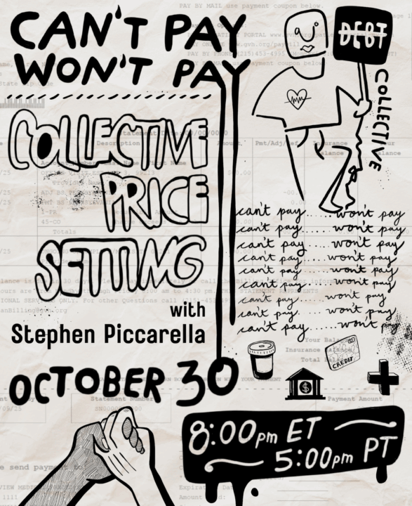 On October 30 at 8pm ET/5pm PT we’ll be holding the first of three sessions on autoreduction or the tactic of collectively setting prices as a means of fighting back against a hostile capitalist system. Join us and Stephen Piccarella to talk about autoreduction — from the autonomia movement of 1970s Italy to Debt Collective today — and our fight to win reparative public goods.
